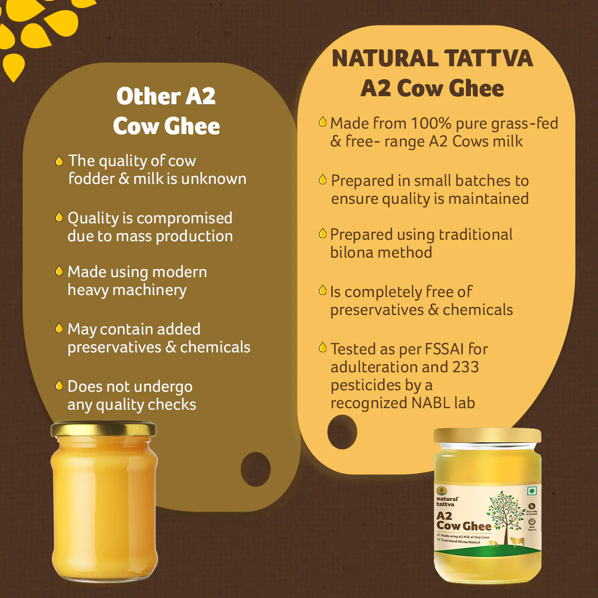 Natural Tattva A2 Cow Ghee is made from the pure A2 milk of gir cows, known for their superior breed and nutrient-rich milk. This pure A2 cow ghee is traditionally prepared using the Bilona method, ensuring every drop retains its natural aroma, taste, and health benefits.